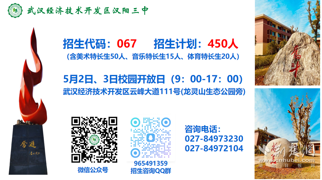 2026年,汉阳三中面向武汉市中心城区招生,招生计划为450人,包含美术特长生50人,音乐特长生15人,体育特长生20人。这意味着该校正式由第二、三批次同时招生,整体升级为第二批次招生,更多学子提供更稳妥、更高质量的升学选择。