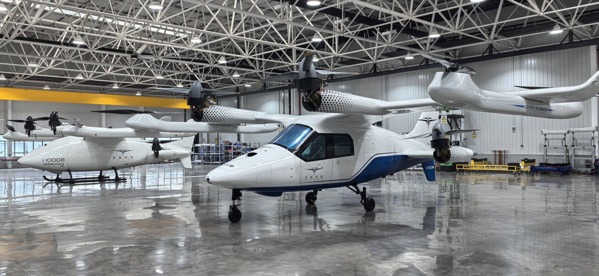 这是武汉迅起科技有限公司(以下简称“武汉迅起科技”)自主研发生产的V1000货运型飞行器,也是国内首款获得民航局TC(型号合格证)受理的大型混动eVTOL。