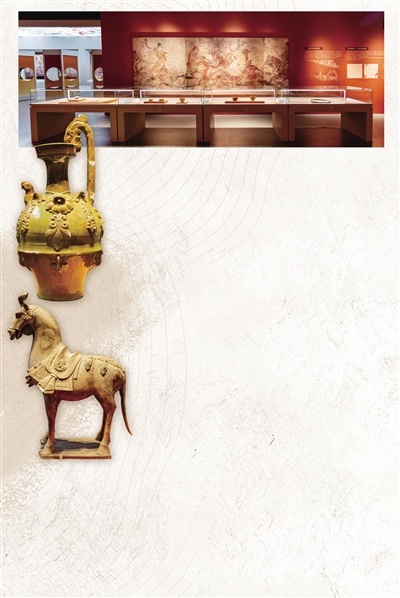 北齐外戚娄睿身份显赫,墓葬规模宏大,出土陪葬品共848件,涵盖陶器、釉陶、玉器、石器、金器等多种质地,种类丰富、制作精美。除数量可观的随葬器物外,墓中还保存有220余平方米壁画,内容涉及出行、仪仗、星象等多个场景,绘画技艺精湛,是研究北齐社会生活与美术成就的重要实物资料。其中,娄睿墓鞍马出行图壁画为首批禁止出境文物。画中马匹昂首嘶鸣,人物浓眉俊目,形象生动传神、跃然壁上,如同千年前的“出游VLOG”。此图以艺术形式融入展览之中。