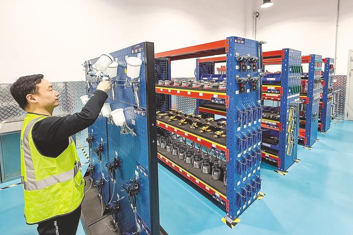 喷漆机库内,工作人员整理工具设备。 (湖北日报全媒记者 倪娜 摄)