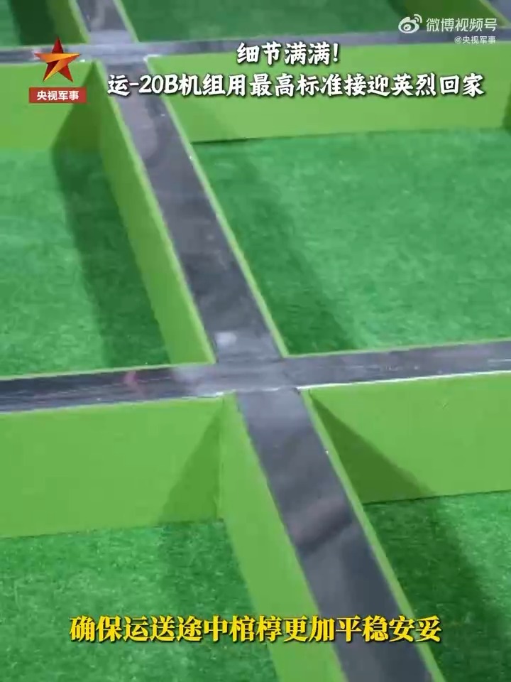 为了接迎英烈回家,运-20B机舱内地面都铺上了军绿色地毯,棺椁架已安装完毕,为了更好地将其固定,部队官兵亲手设计制作了专用系留锁。每一处内侧四周,还细心贴好了防撞条,确保运送途中棺椁平稳安妥。