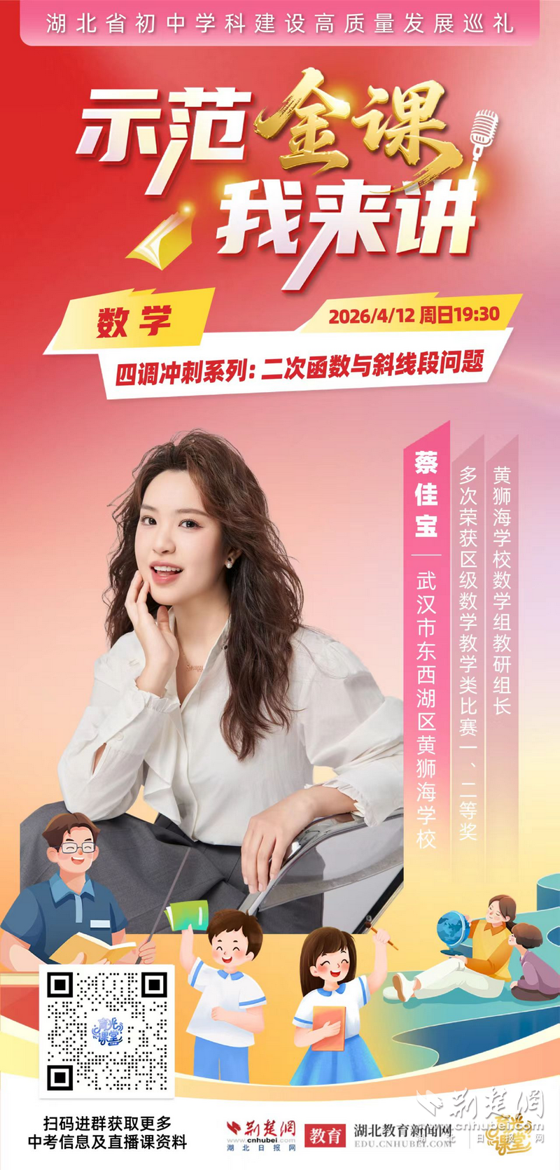 荆楚网(湖北日报网)讯(记者齐一璇)初三数学中考复习中,二次函数压轴题常涉及斜线段计算、最值及面积比等问题,学生普遍存在“转化困难、计算繁琐”两大痛点。4月12日晚,一场“思维突围”在云端展开。在“示范金课我来讲——湖北省初中学科建设高质量发展巡礼”活动中,武汉市东西湖区黄狮海学校数学教研组组长蔡佳宝老师,带来一堂“二次函数与斜线段问题”示范课,用“化斜为直”这一核心策略,系统讲授如何突破转化难点、优化计算路径,帮学生拿下压轴题。