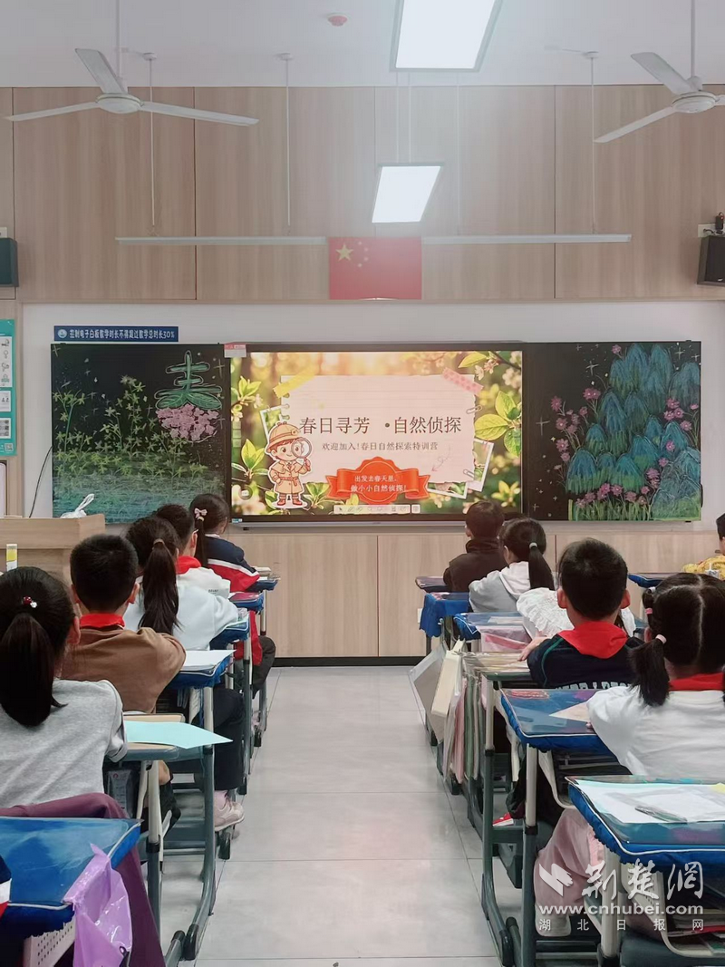 荆楚网(湖北日报网)讯(记者齐一璇 通讯员曲婧、刘祉萱)近日,武汉市育才华岭小学三(4)班开展了一场“春日寻芳·自然侦探”班会活动。活动以“室内教学+室外实践”的融合模式,让学生在探索中感知自然之美,在创作中定格春日美好。