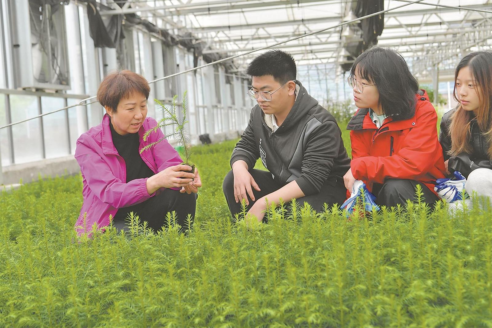 4月21日,在襄阳市林业科学研究所国家秃杉良种基地,林业专家冷英向华中农业大学林学专业学生介绍秃杉一代苗的生长情况。