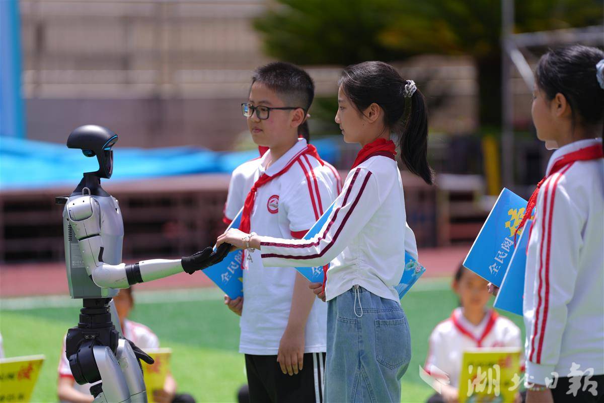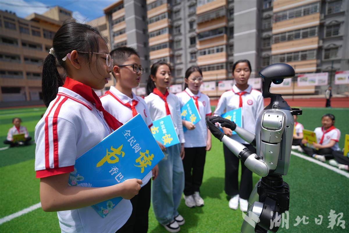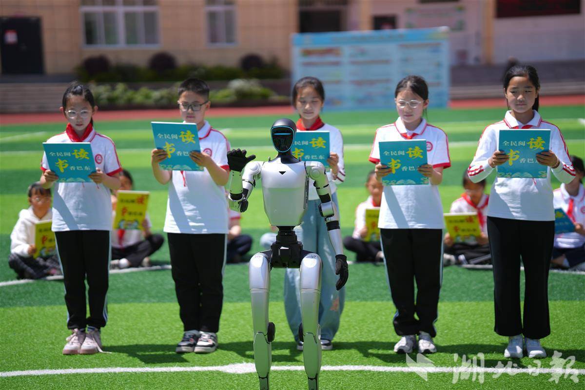 4月22日,在巴东县信陵镇光明小学,学生正与机器人一起阅读、一起对话。