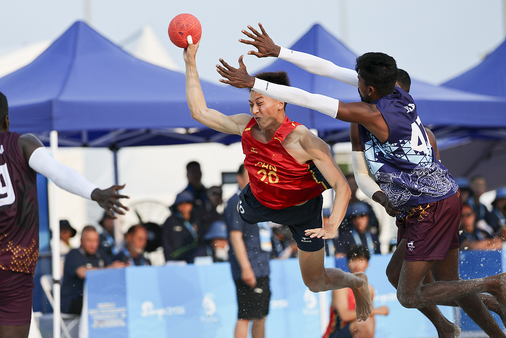 2026年4月21日,海南三亚,第六届亚洲沙滩运动会迎来首个比赛日。在沙滩手球男子组小组赛中,中国队2比0战胜斯里兰卡队。图为中国队射门。