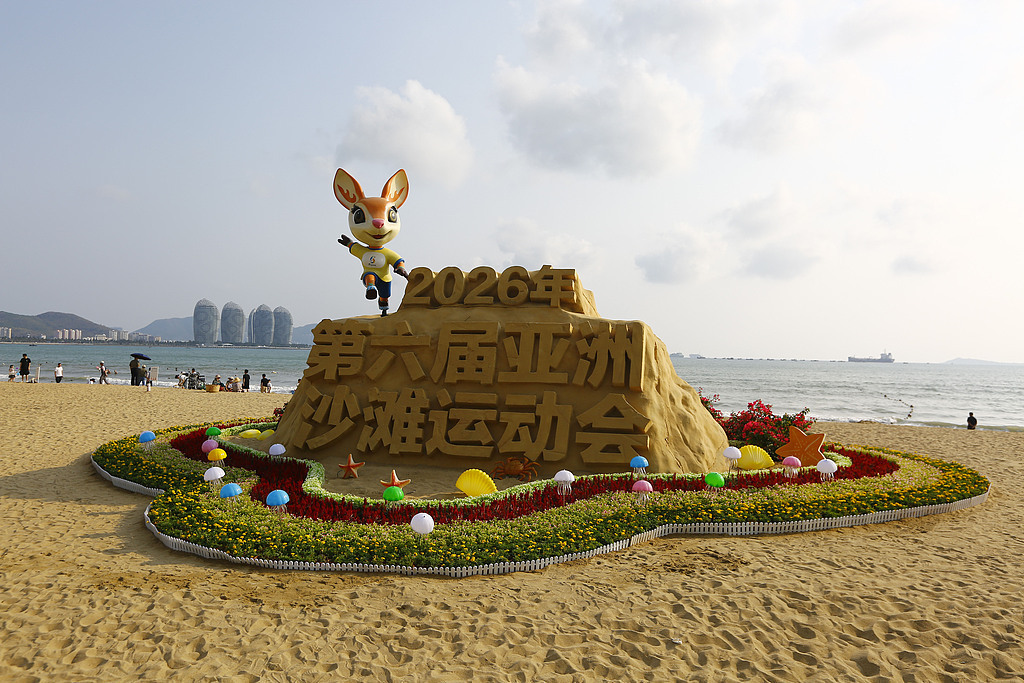 2026年4月21日,海南三亚,2026年第六届亚洲沙滩运动会沙雕在三亚湾向市民游客展示亮相。