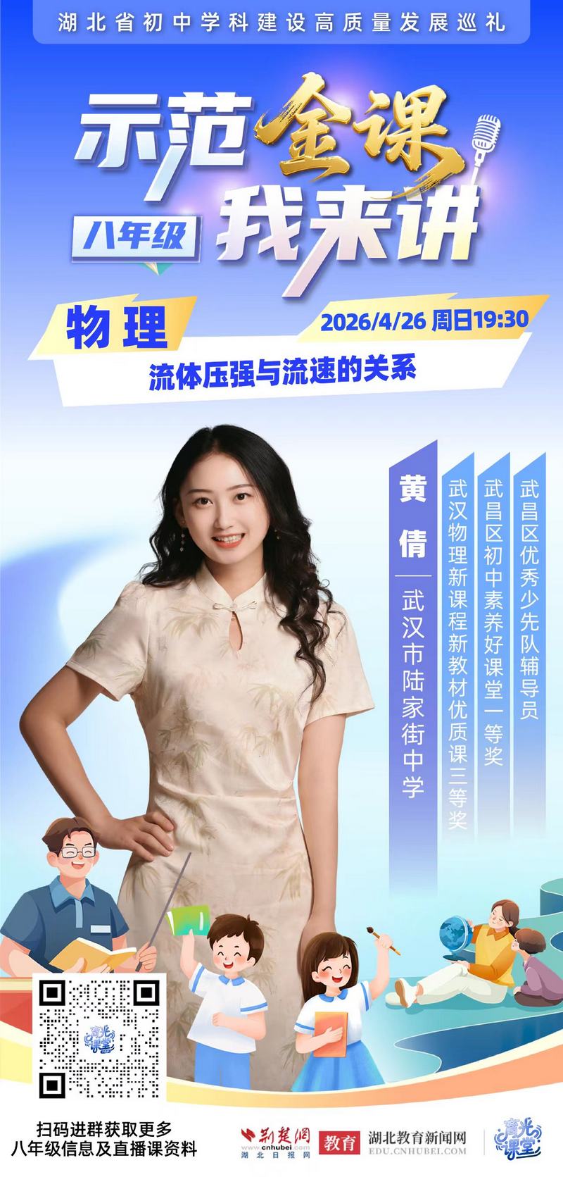 荆楚网(湖北日报网)讯(记者齐一璇)“示范金课我来讲——湖北省初中学科建设高质量发展巡礼”活动持续升温,4月26日晚7:30,武汉市陆家街中学的黄倩老师将开启直播,为你揭开流体压强的神秘面纱,助力物理成绩飙升。
