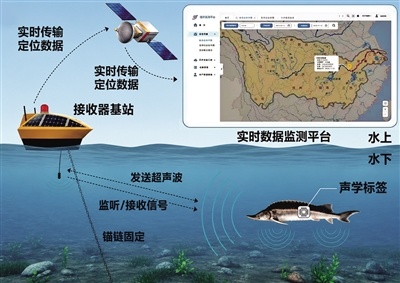 王瑞接着介绍,水面基站搭载北斗定位、5G通信、太阳能供电等部件,全天候值守江面,精准捕捉水下标记载体的信号,同步采集水温、流速等生态水文数据。而分析监测后台,可以实时汇总全域信息,快速研判鱼群实时位置、移动轨迹,所有数据本地加密存储。