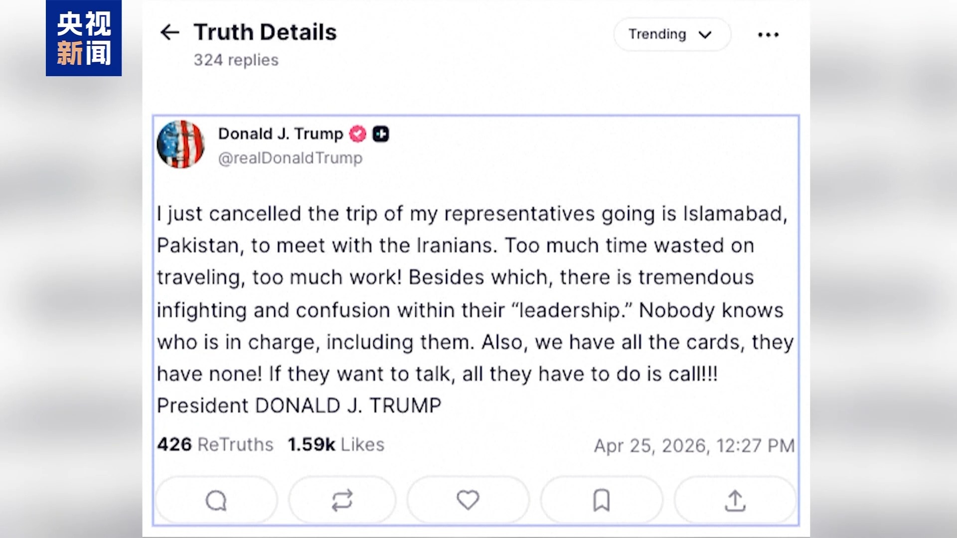 总台记者 李曌:同一天,美国总统特朗普宣布,美总统特使威特科夫和特朗普女婿库什纳原定于25日赴巴基斯坦的行程已经取消。特朗普表示,美方完全掌握主动权,如果伊朗想要对话,什么时候打来电话都行。特朗普还表示,取消代表团行程并不意味着局势将重新回到战争状态,目前尚未考虑这一选项。