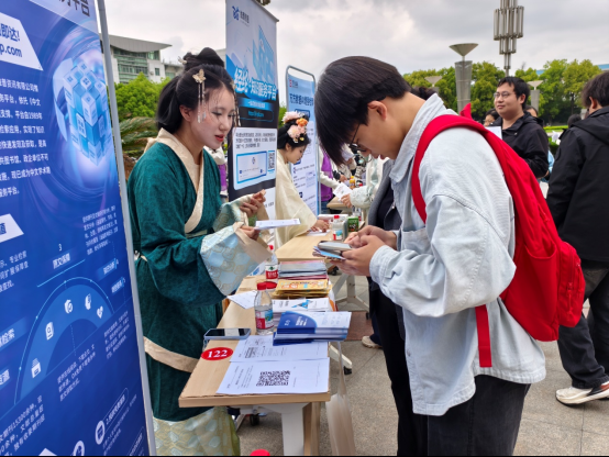 游园会现场,9名身着汉服的“NPC”格外引人注目。她们化身“数字阅读推广大使”,穿梭于各展位之间,向同学们热情推介图书馆12个高利用率数据库资源,涵盖学术期刊、电子图书、学习工具等多个类别。不少同学表示,通过汉服NPC的面对面讲解和现场演示,自己对数据库的功能和使用方法有了更直观、更深入的了解,提升了信息检索与科研学习能力。