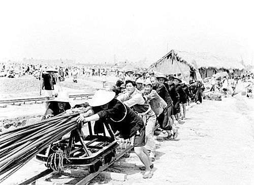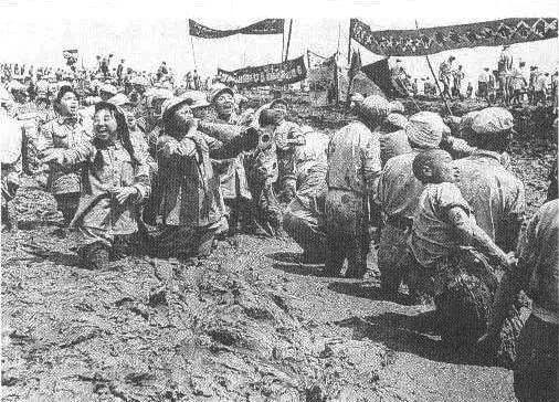 1952年汛前抢建荆江分洪工程。图为清淤现场。(资料图片,荆江分洪工程南北闸管理处提供)