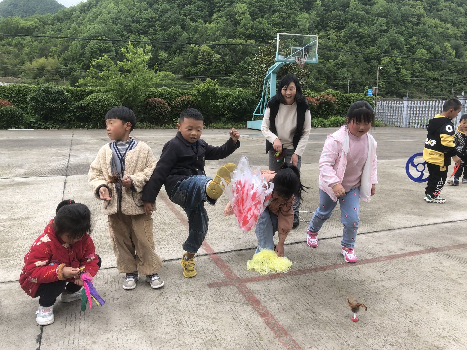 “快看,这不是我们小时候特别爱玩的游戏吗?估计我现在已经忘记铁环怎么滚动了!”“对呀,我小时候特别喜欢踢毽子,我还是我们班踢毽子冠军呢!”路过幼儿园的人们看到孩子们开心的游戏,都驻足观赏,不时发出一阵阵感叹。