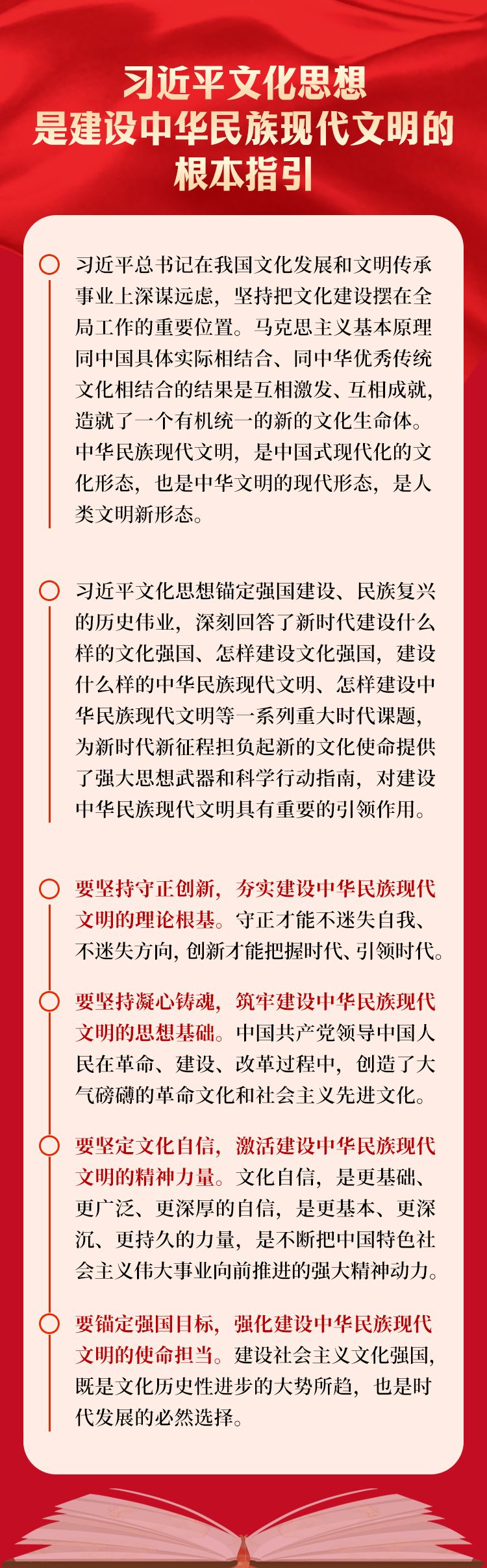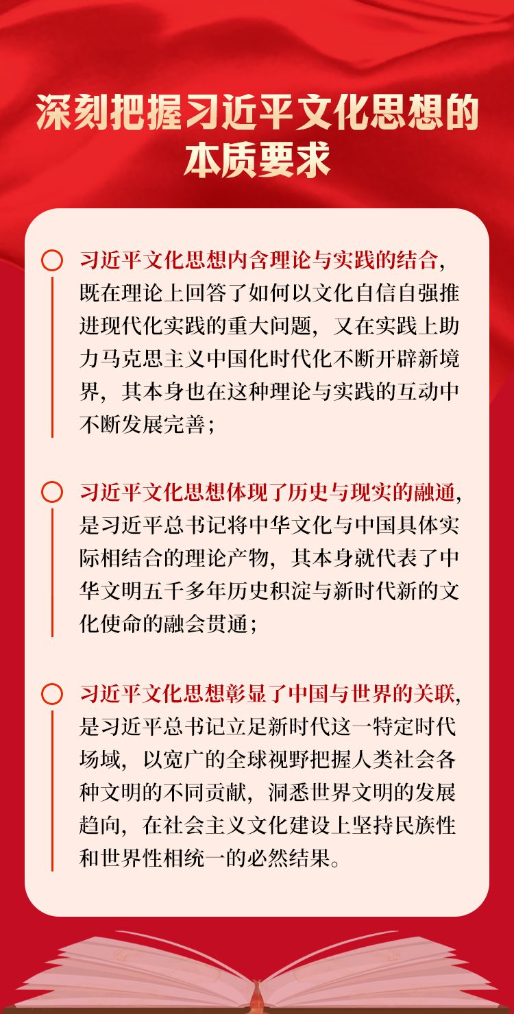 我们要深刻把握习近平文化思想的本质要求,坚持党的文化领导权,担负起新的文化使命,在文明交流互鉴中推进中华民族现代文明建设,努力铸就中华文化新辉煌。