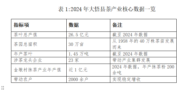 截至2024年,大悟县茶产业已形成相当规模,并展现出强劲的增长势头。具体数据如下表所示: