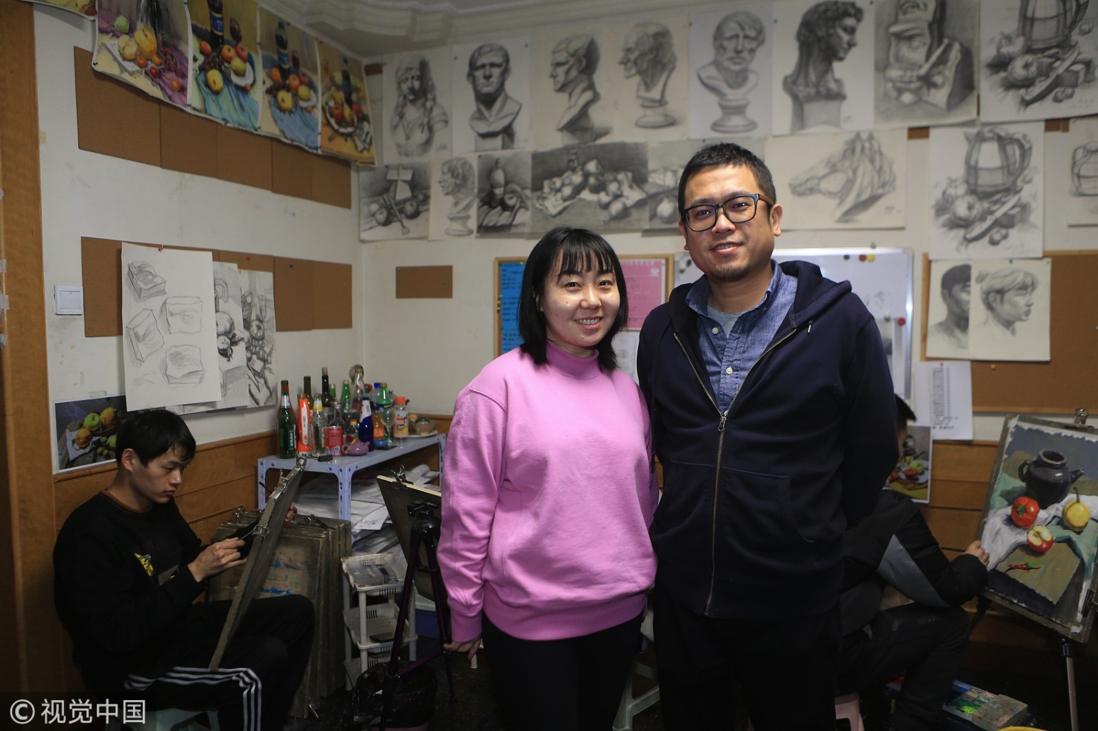 2007年,许微笑毕业。一年后,与毕业于长春大学美术系的孙晓苍结婚。两人感情很好,结婚后找过很多工作,深感作为聋哑人进入社会的不易。西安市一直没有一家由聋哑人开办、面向聋哑艺术学生的专业培训班,夫妇俩就决定用自己的专业所长,弥补这一空白。图为许微笑和丈夫孙晓苍穿梭在学生中间,用手语点评每件作品,互动交流。