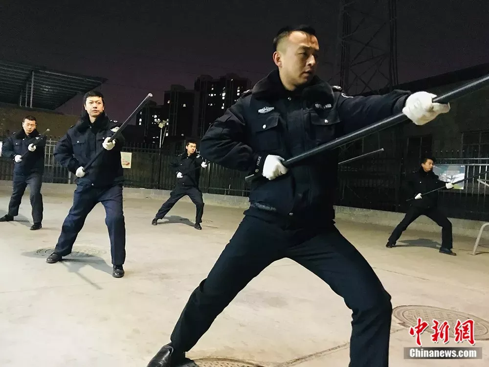 傍晚,押运员在练习棍棒技能。 艾庆龙 摄