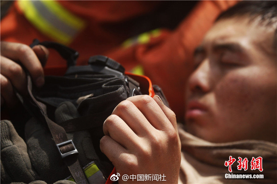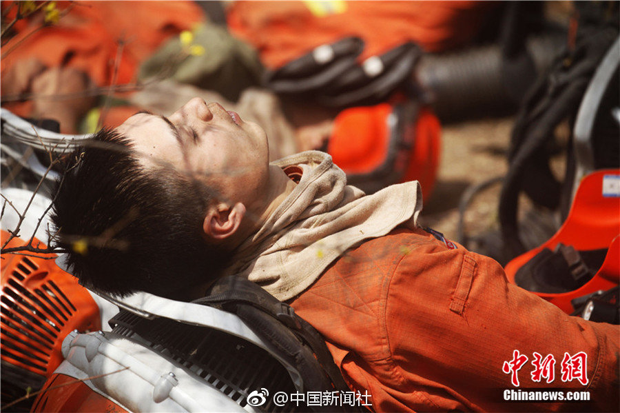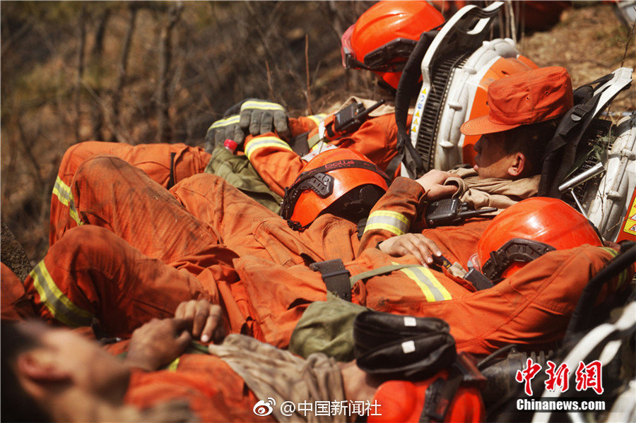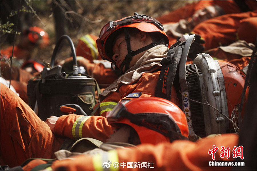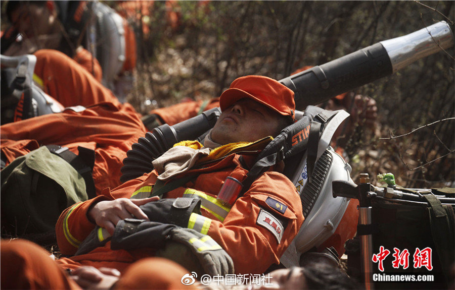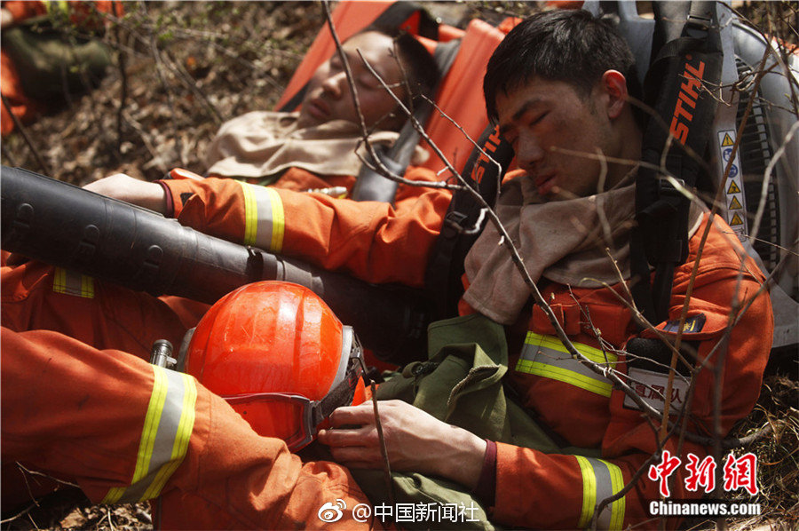 由于火场形势严峻、火线处于高山险地地带,距离宿营地较远,疲惫到了极点的指战员背负灭火装备席地而睡。
