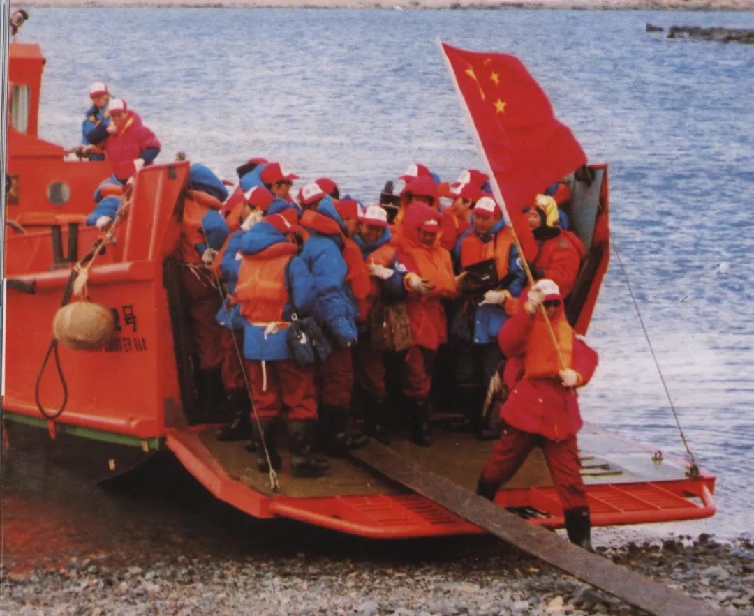 经过一个多月的航行,队长郭琨高举五星红旗,颜其德和队友们紧跟其后,登上南极洲大陆。大家高喊:“南极洲,我们中国人来了!”