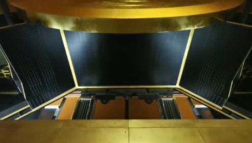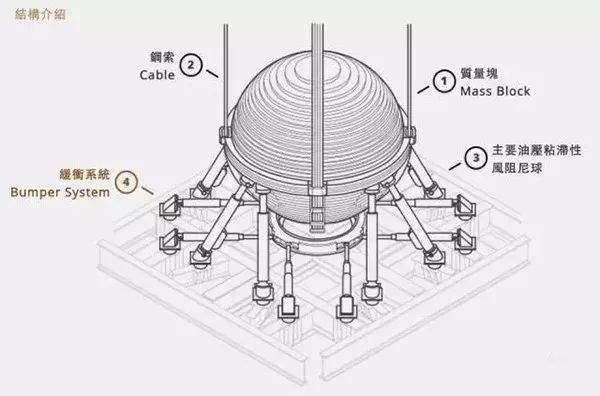 风阻尼器由质块、弹簧与阻尼系统组成,其下有精妙的机械结构,就好比一个巨大的钟摆。在大风来袭时它可以通过自身反方向的晃动,产生与风向相反的力量,从而抵消风力,加强对建筑物的“定力”。