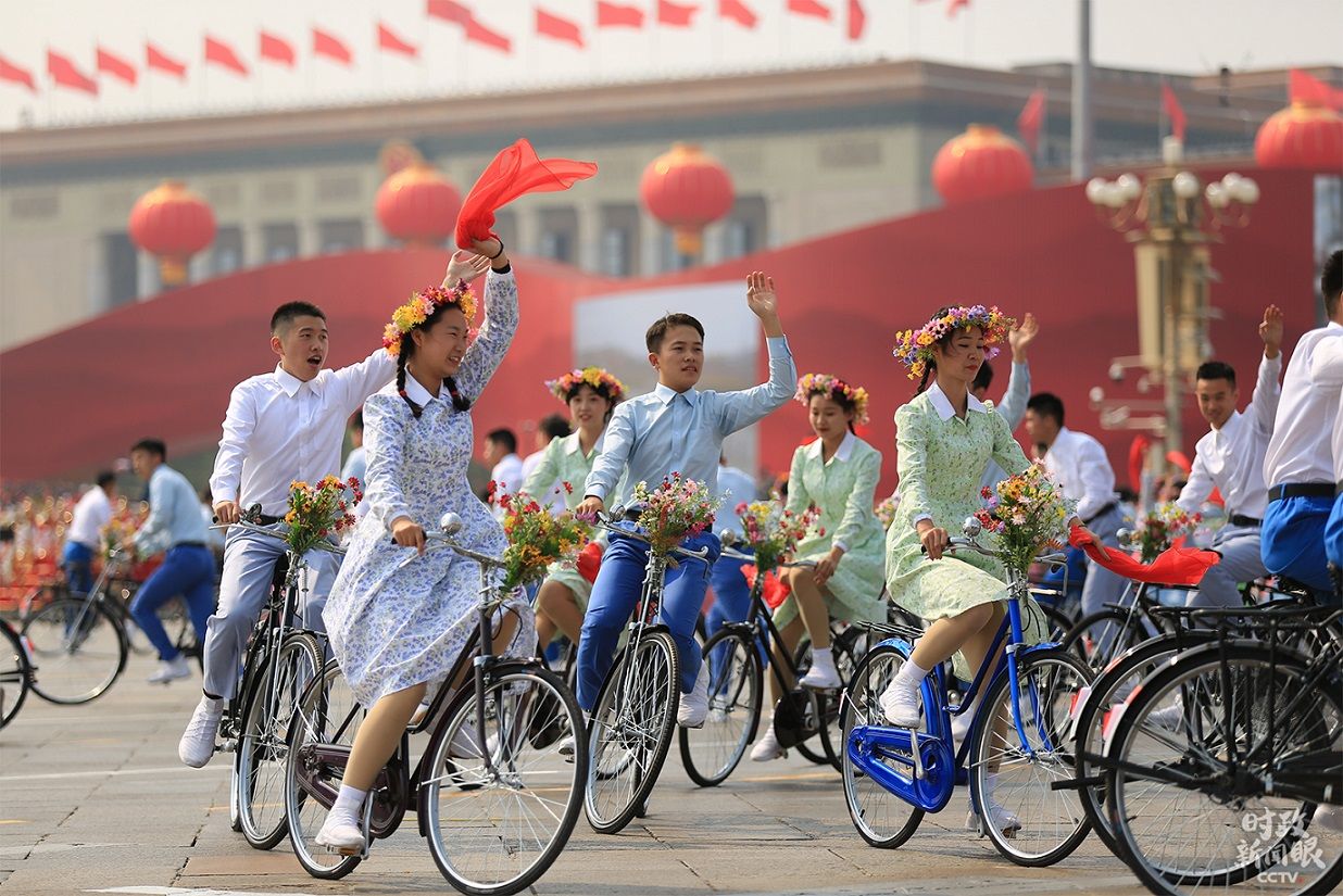 △游行共有三个篇章,每个篇章的结尾都设计了一个情境式行进。其中第一篇章“建国创业”在情境式行进“青春万岁”中结束,少男少女骑着自行车穿梭而过,汇成一道年代风景。(央视记者张淳拍摄)