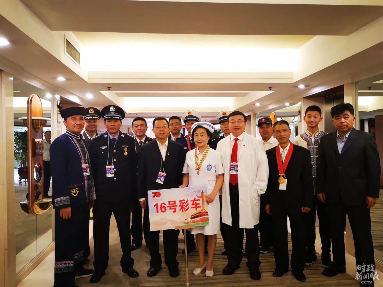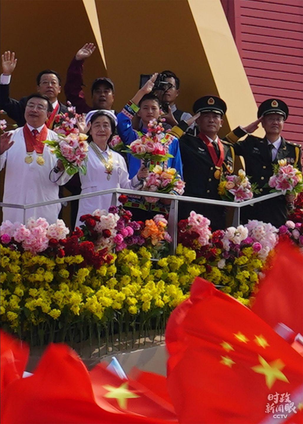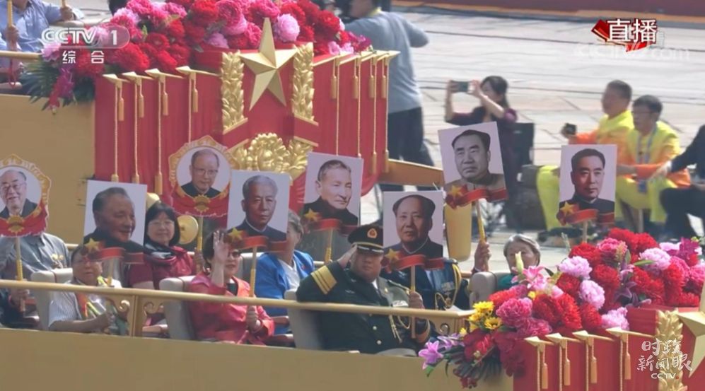 △第一辆礼宾车上,是6位新中国缔造者的亲属代表、3位老一辈科学家的家属代表和9位老红军老八路军老解放军。