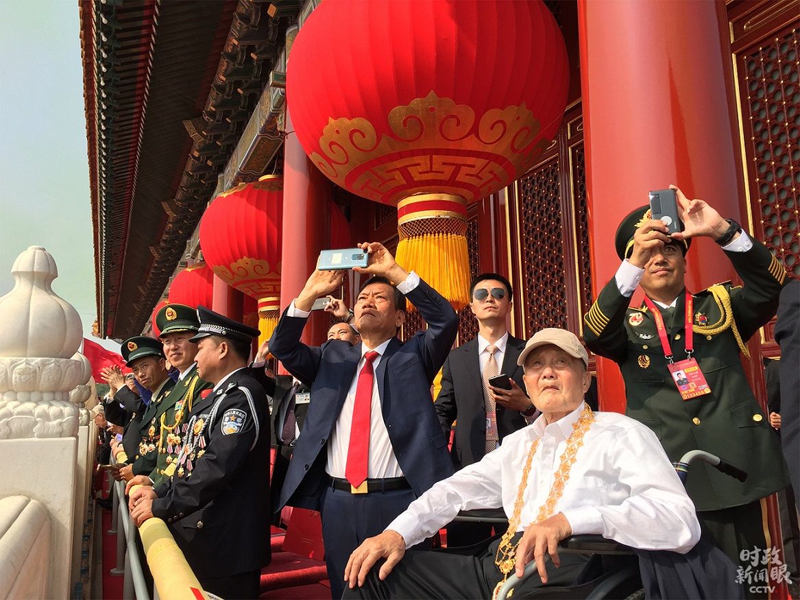 △“共和国勋章”获得者张富清在城楼上观看阅兵式。(央视记者郭鸿拍摄)