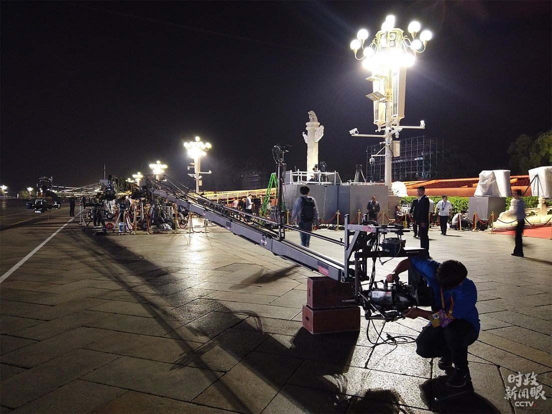 △中央广播电视总台的工作人员在调试摇臂。分列式方阵的镜头就靠它了。(央视记者沈忱拍摄)