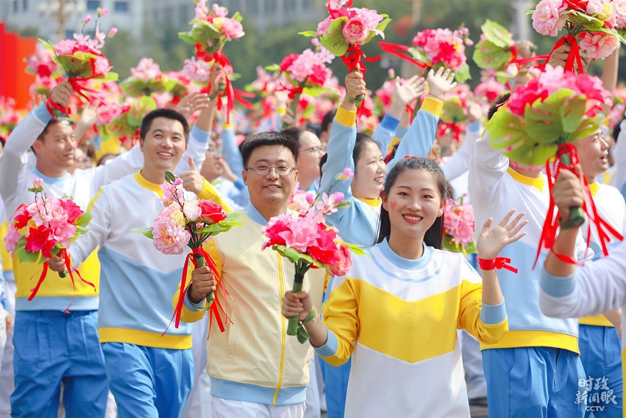 阅兵式之后紧接着举行了群众游行。这次群众游行以“自由、生动、欢愉、活泼”为基调,尽量减少表演痕迹,回归群众游行的本质,创造最真实、最自然的“为祖国庆生”氛围。《时政新闻眼》在现场也感受到了这一变化。