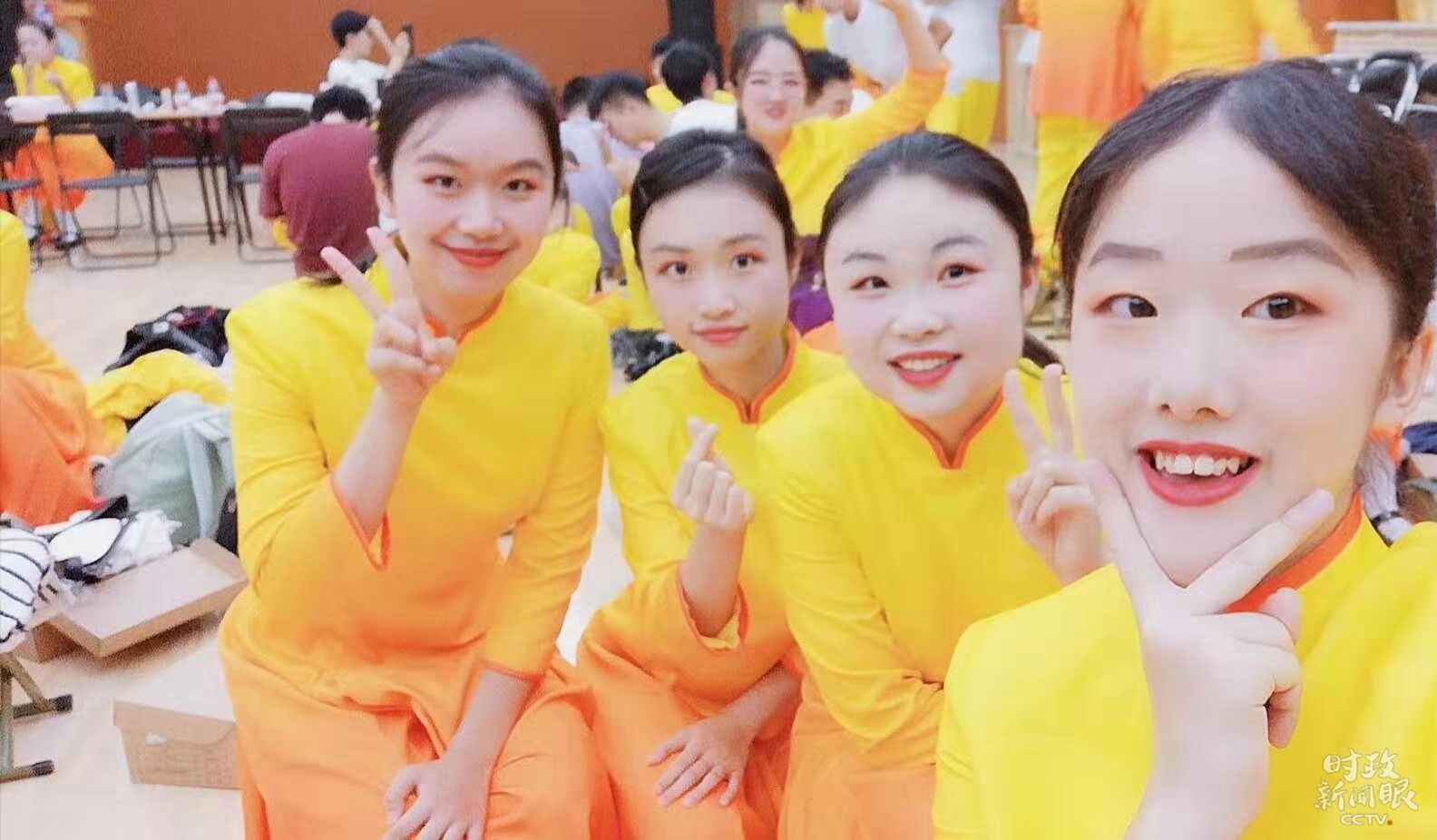 △郎铮的妈妈告诉《时政新闻眼》,今年14岁的郎铮正在绵阳上初三。这是妈妈提供的郎铮与16号彩车人员的合影。右二为郎铮。