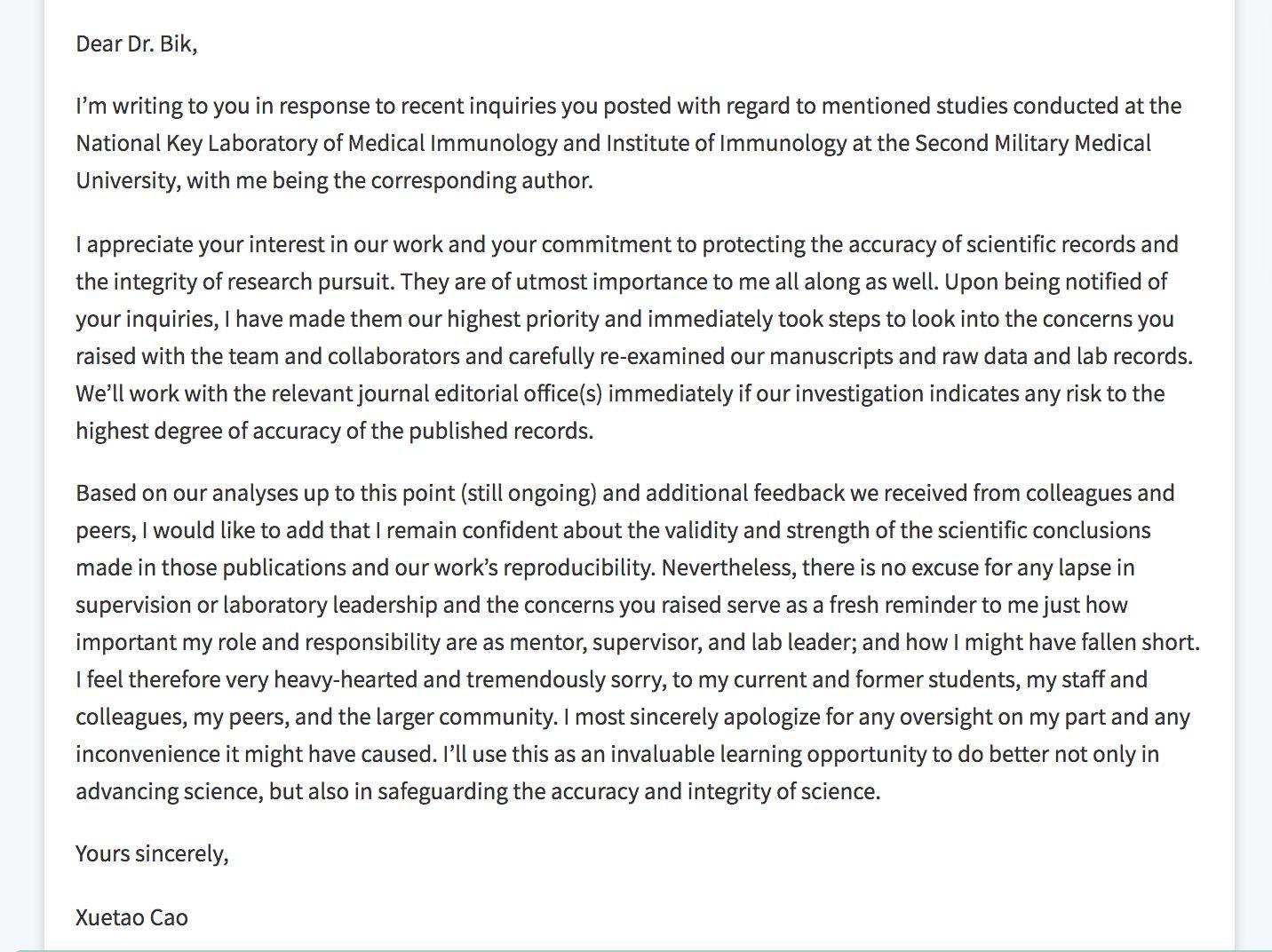 而截至发稿,PubPeer网站上关于曹雪涛教授被质疑的论文超过40篇。澎湃新闻发现,11月17日晚,曹雪涛教授在PubPeer网站上作出回应,他表示,已立即采取行动展开调查,“我对(涉及到)的这些出版物所得出的科学性结论的有效性,以及我们工作的可重现性仍然充满信心。然而,作为实验室的把关人或领导者,任何失误都是没有借口的。我将以此作为宝贵的学习机会,不仅在促进科学进步方面做得更好,而且在维护科学的准确性和诚实度方面做得更好。”