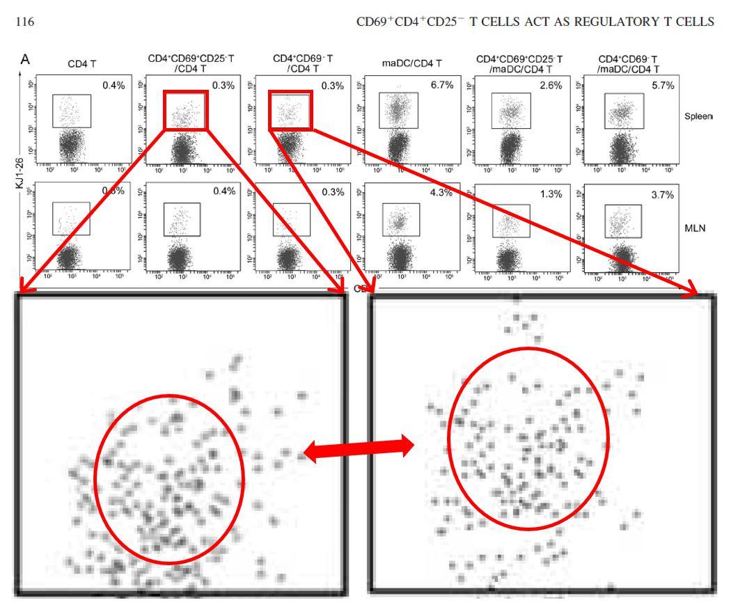 该论文Fig. 4几组流式细胞仪检测组疑似存在相似。图片来源:PubPeer和原始论文。论文题目:CD69+ CD4+ CD25-T cells, a new subset of regulatory T cells, suppress T cell proliferation through membrane-bound TGF-beta1