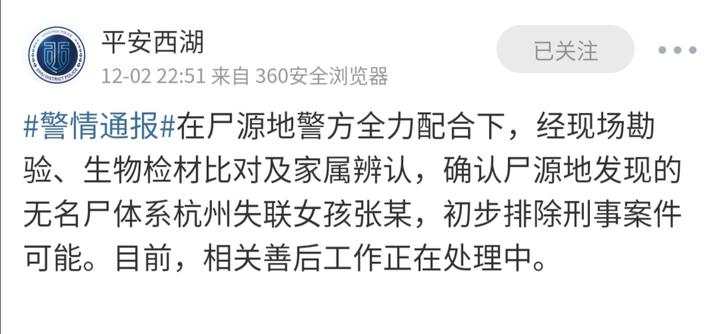 经过数日的等待,噩耗传来。12月2日晚上22点51分,“平安西湖”发布通报:在尸源地警方全力配合下,经现场勘验、生物检材比对及家属辨认,确认尸源地发现的无名尸体系杭州失联女孩张某,初步排除刑事案件可能。目前,相关善后工作正在处理中。