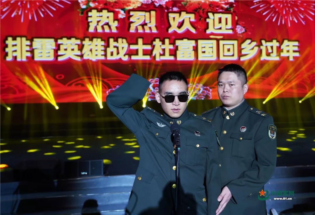 晚上,在湄潭县春节联欢晚会直播现场,家乡人民给予了杜富国最高的礼遇,大屏幕上打出“热烈欢迎排雷英雄战士杜富国回乡过年”的字幕,现场掌声不断。面对镜头,杜富国深情地说:“我心情很激动,一回到家就感受到了家乡人民的热情,被浓浓亲情围绕,我感到很幸福!祝福大家团团圆圆、新年快乐!”杜富国军姿挺拔,举起断臂,向家乡人民敬上庄严的军礼。