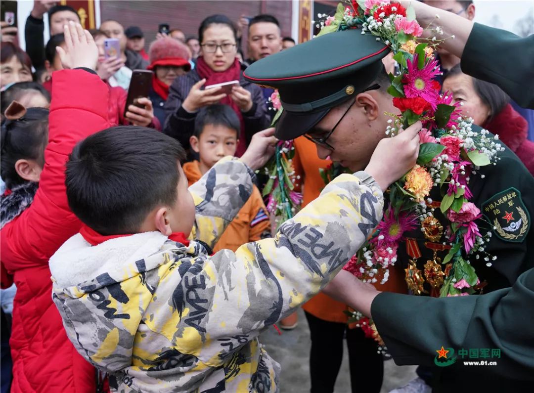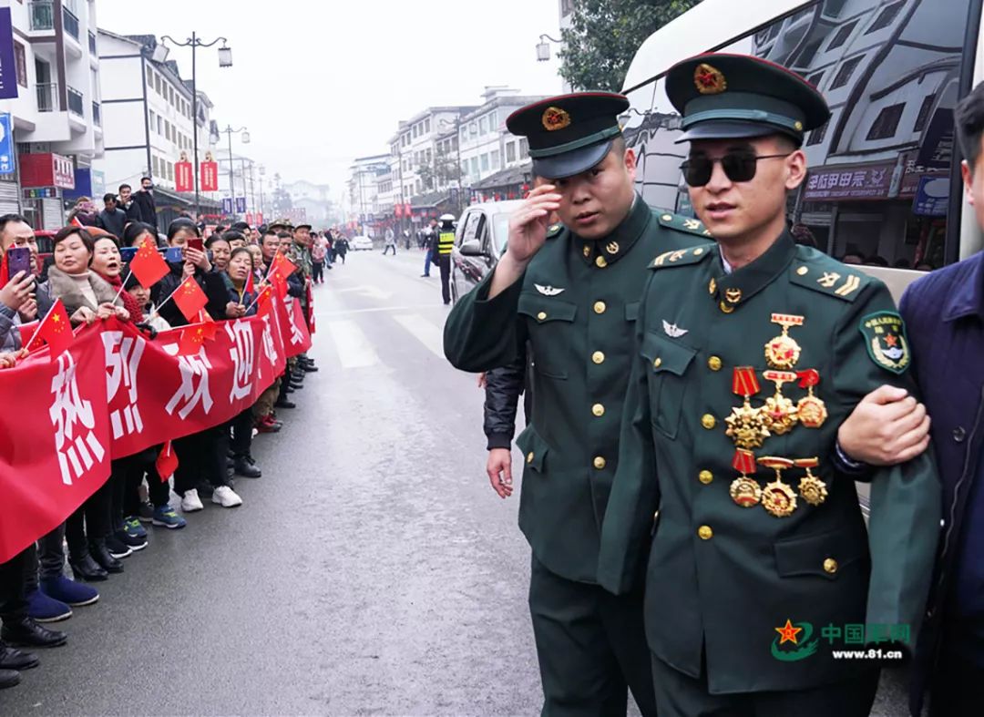 下午2点10分许,当杜富国乘坐的车辆缓缓驶入兴隆镇,等待的人群便沸腾了。人们欢呼着杜富国的名字,高喊着“向英雄学习”“向英雄致敬”“欢迎富国回家过年”的口号。下车后,胸前戴满军功章的杜富国,在战友的搀扶下,不断挥动胳膊,和乡亲们打着招呼。在杜富国家门前,系着红领巾的两名小学生跑步上前敬礼,为杜富国戴上花环。