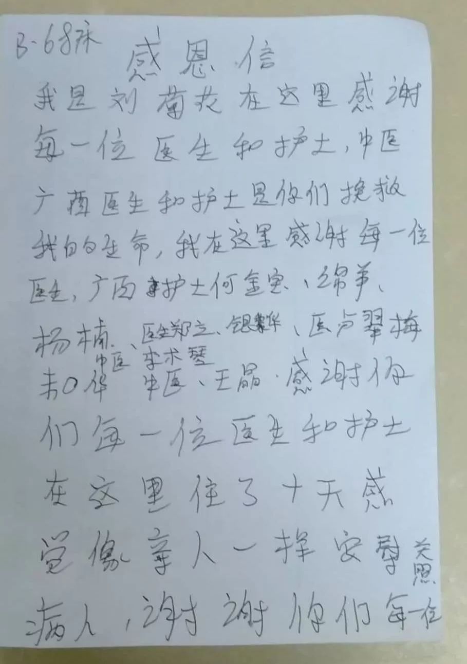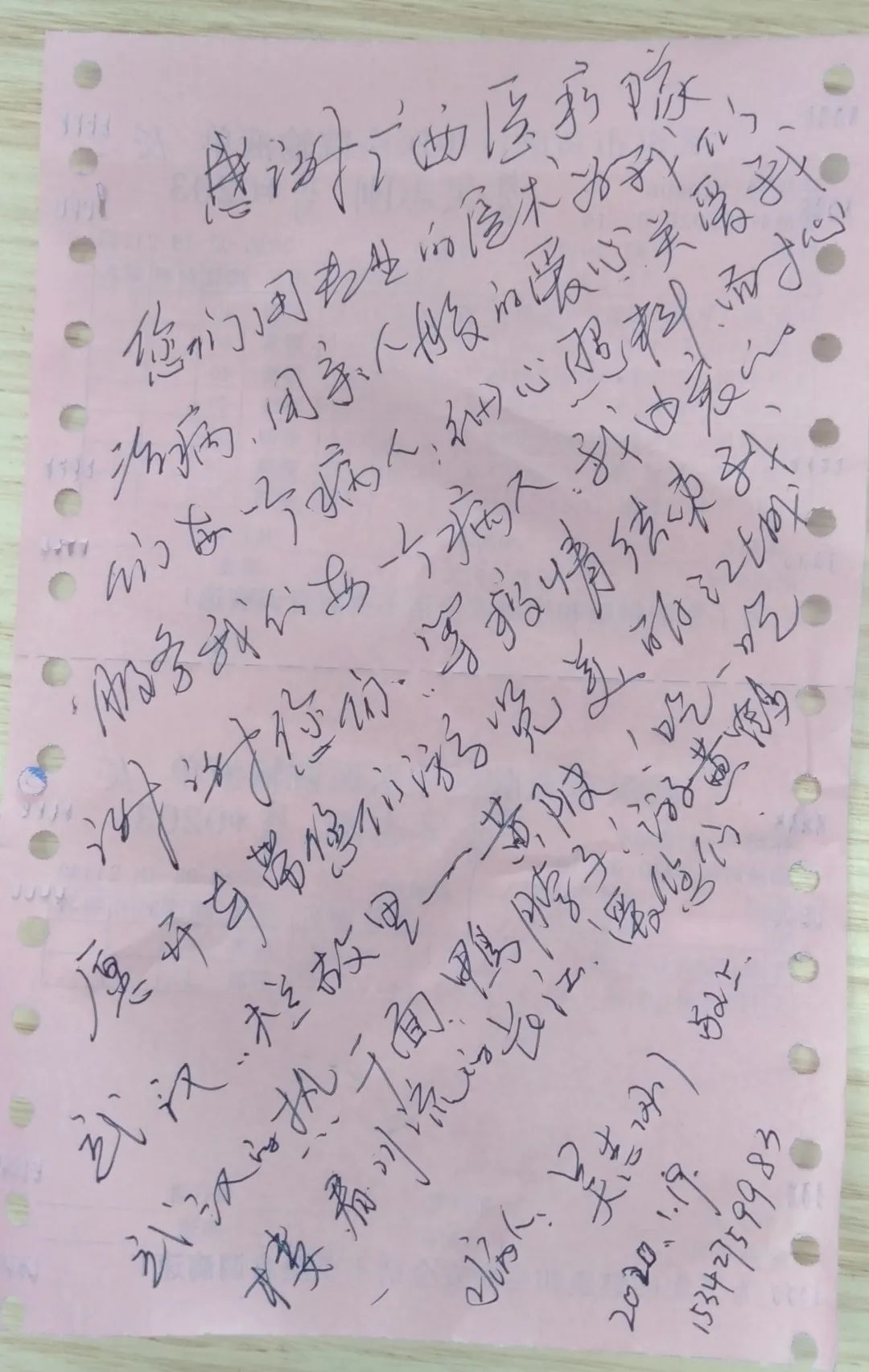 截至2月19日,广西首批支援湖北抗疫医疗队,累计收治病人数为260例,其中重型人数77例,危重症人数43例,已治愈出院人数41例。病人写的感谢信接踵而至,他们发自肺腑感谢医护人员的悉心照顾。