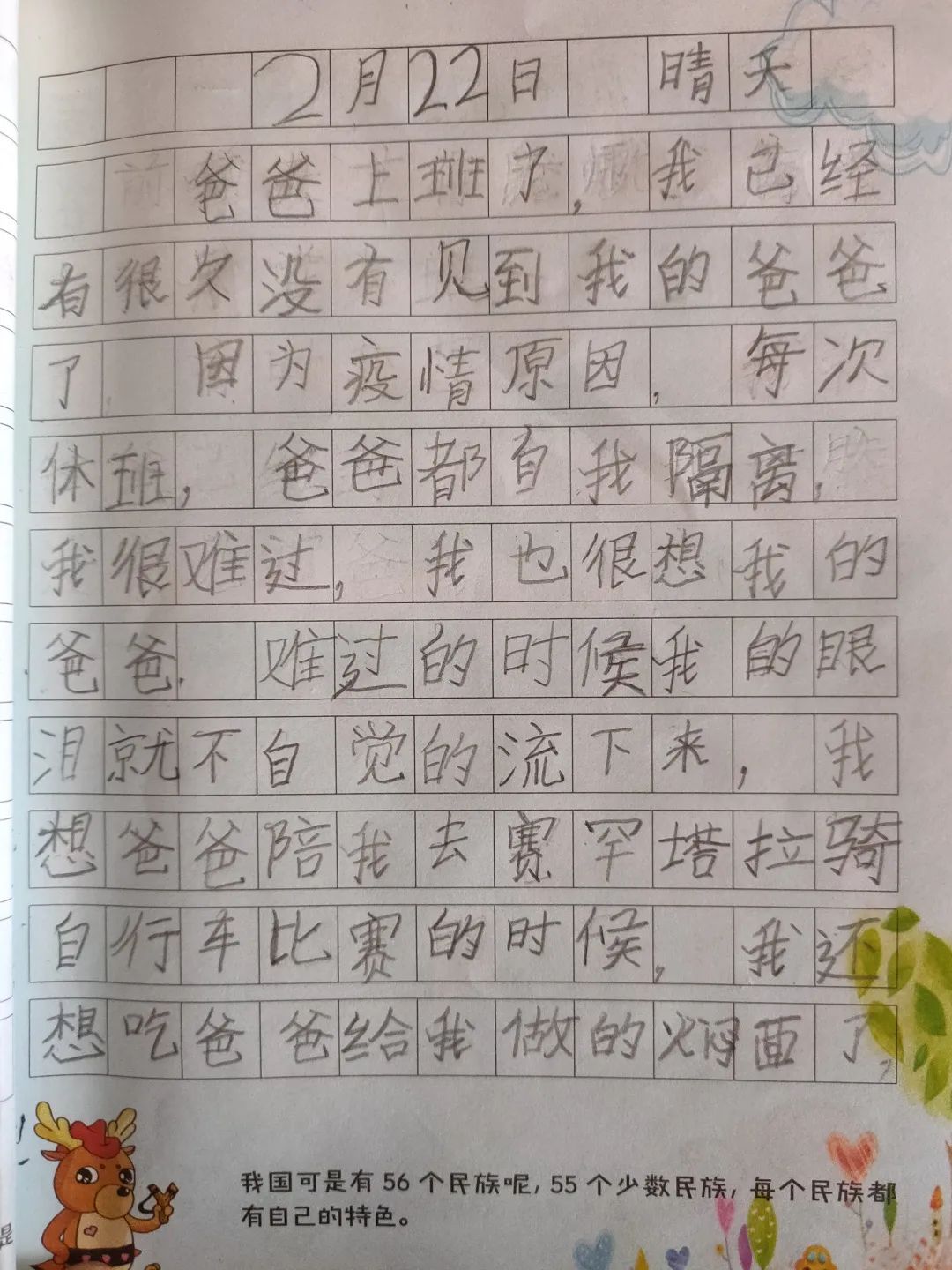 见不到爸爸,宁浩然就在日记里写下对爸爸的思念:我已经有好久没有见到爸爸了。我想爸爸陪我去赛汉塔拉去骑自行车,我还想吃爸爸做的焖面……爸爸与病毒战斗,爸爸带着他做游戏,宁浩然画的一张张美丽图画,订成了厚厚一摞。他想告诉爸爸:“春天到了,爸爸早点回家,陪我一起去放风筝!”