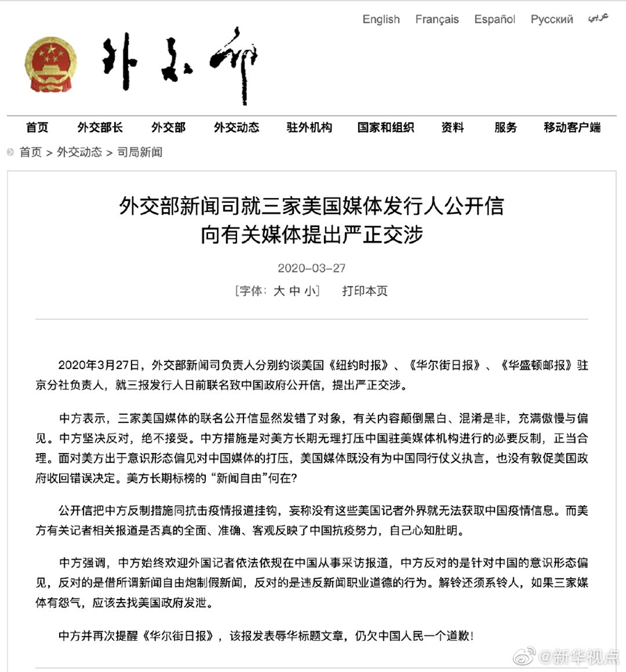 3月27日,外交部新闻司负责人分别约谈美国《纽约时报》《华尔街日报》《华盛顿邮报》驻京分社负责人,就三报发行人日前联名致中国政府公开信,提出严正交涉。