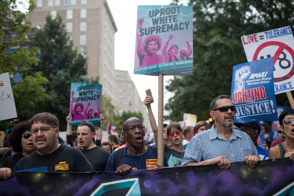 2018年8月12日,在美国首都华盛顿,人们举着反对极右势力的标语牌参与游行。(新华社/法新)