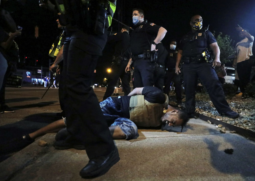 5月28日,在美国明尼阿波利斯,抗议者痛苦倒地。(新华社/美联)