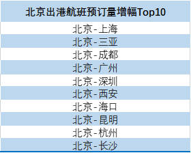 受此影响,北京出港航班预订量也大幅增长。去哪儿网平台上,北京-上海航班预订量增幅最高、其次是北京-三亚以及北京-成都。