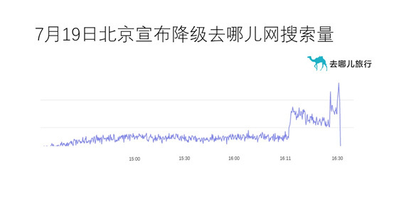 7月19日,北京市政府副秘书长陈蓓宣布将从20日0时起,北京市突发公共卫生事件应急响应级别由二级降为三级,逐步限流开放景区等室内外场馆。去哪儿网数据显示,进出京机票搜索量应声上涨,与前一小时相比增长7倍。