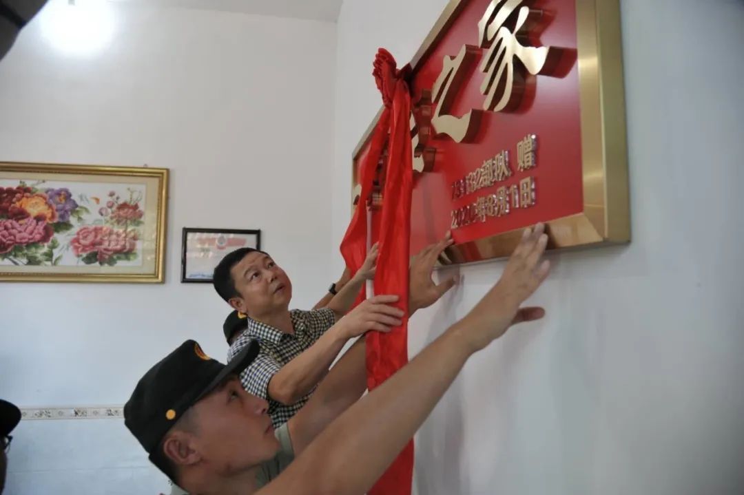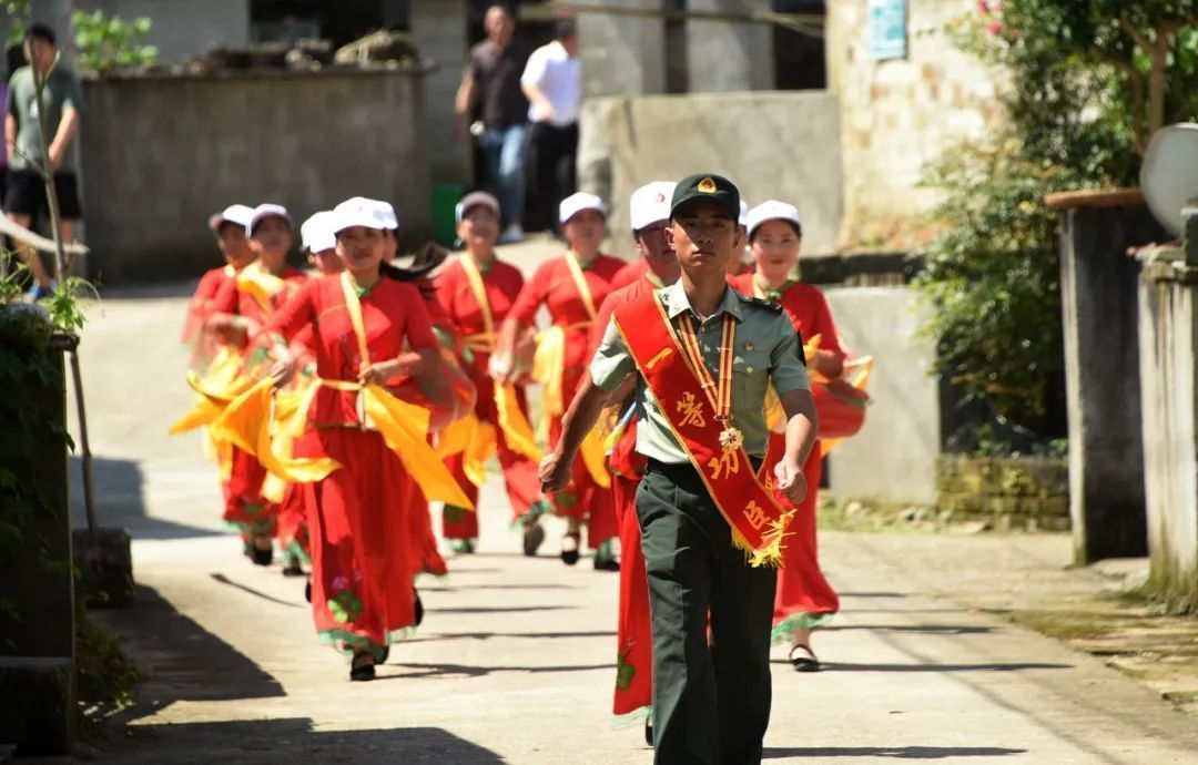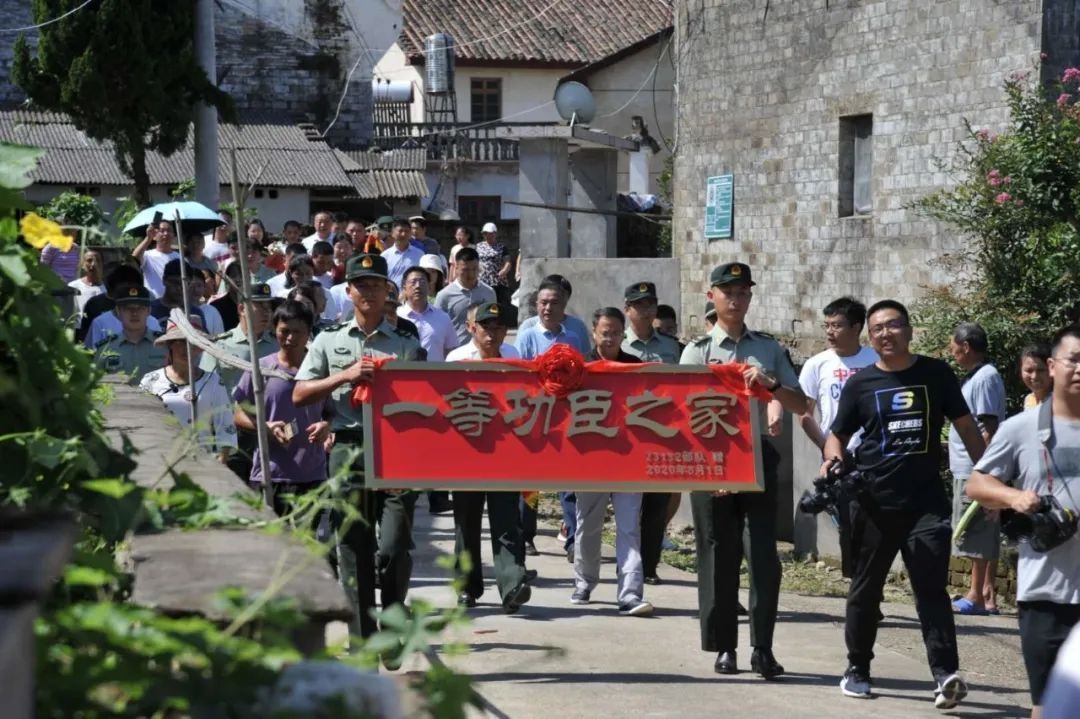送喜报的队伍抬着“一等功臣之家”牌匾