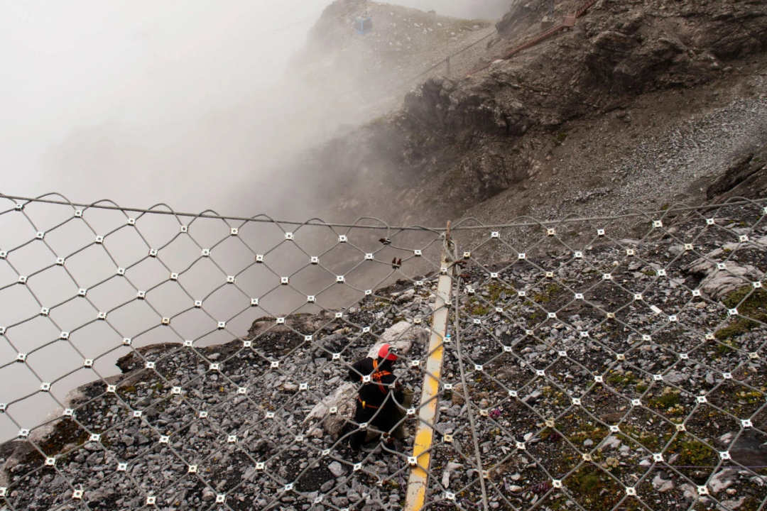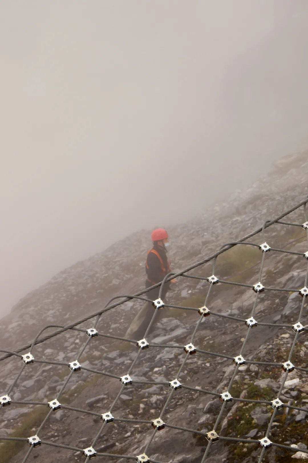 在海拔4506米的栈道东侧,27岁的和兆鸿戴着红色安全帽、身着安全服,在队友的协助下,慢慢爬下山,捡起崖壁上的垃圾。