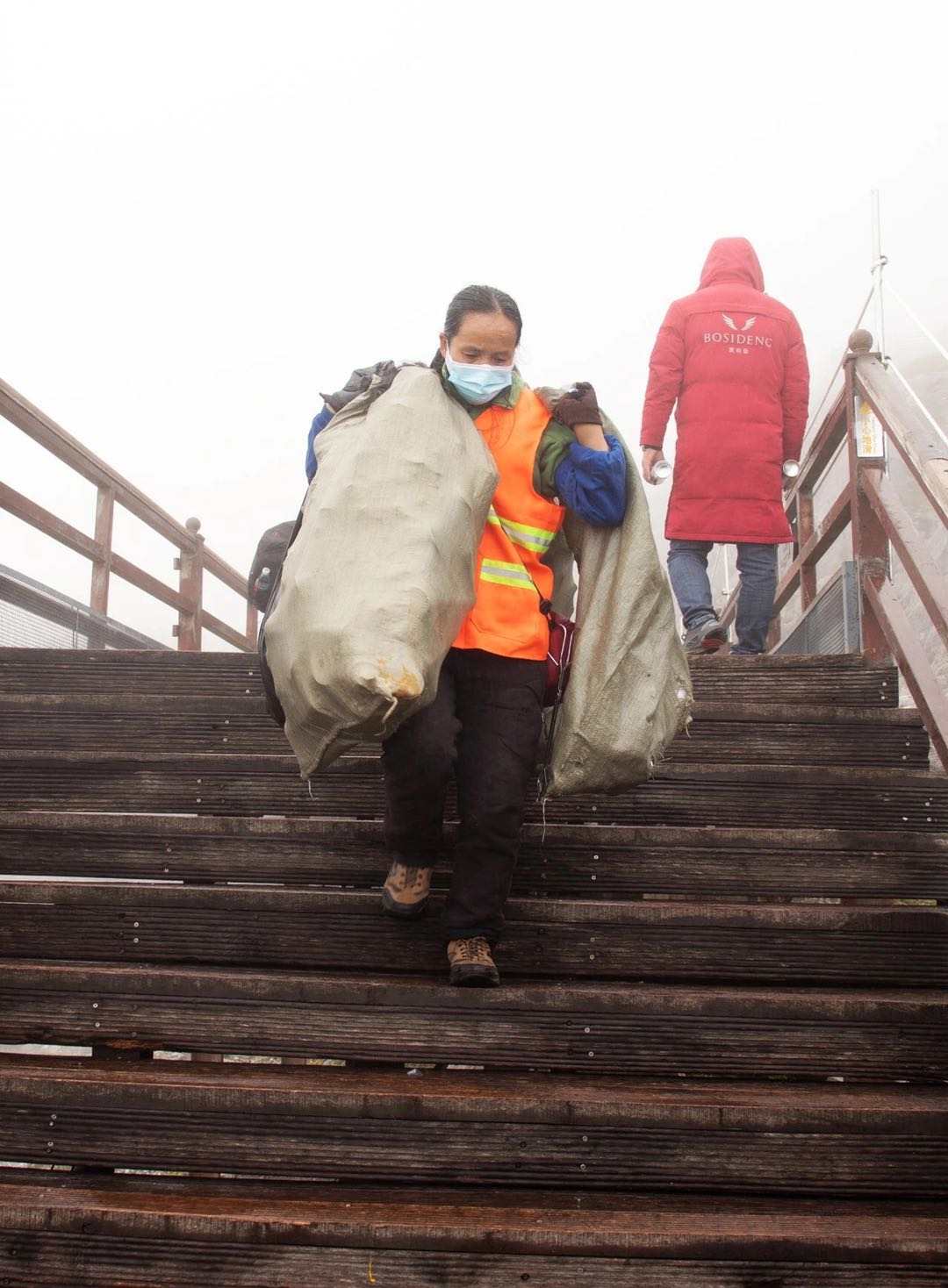 两手空空都有些寸步难行,而阿四嬢却要把氧气瓶装满整整4个编织袋,全部背下来。最多的时候她得扛5袋。
