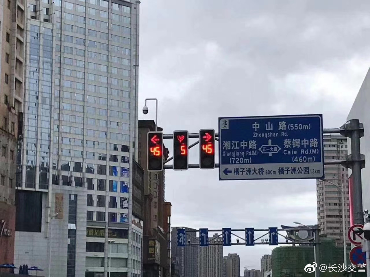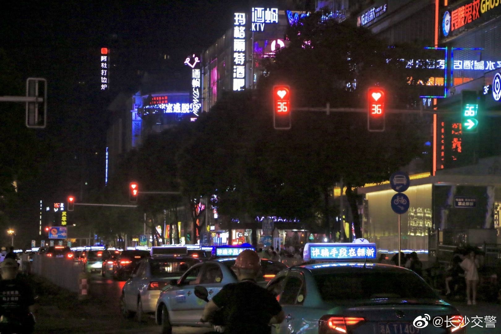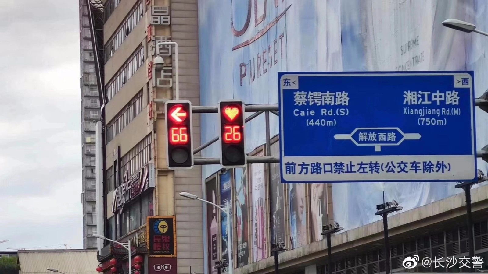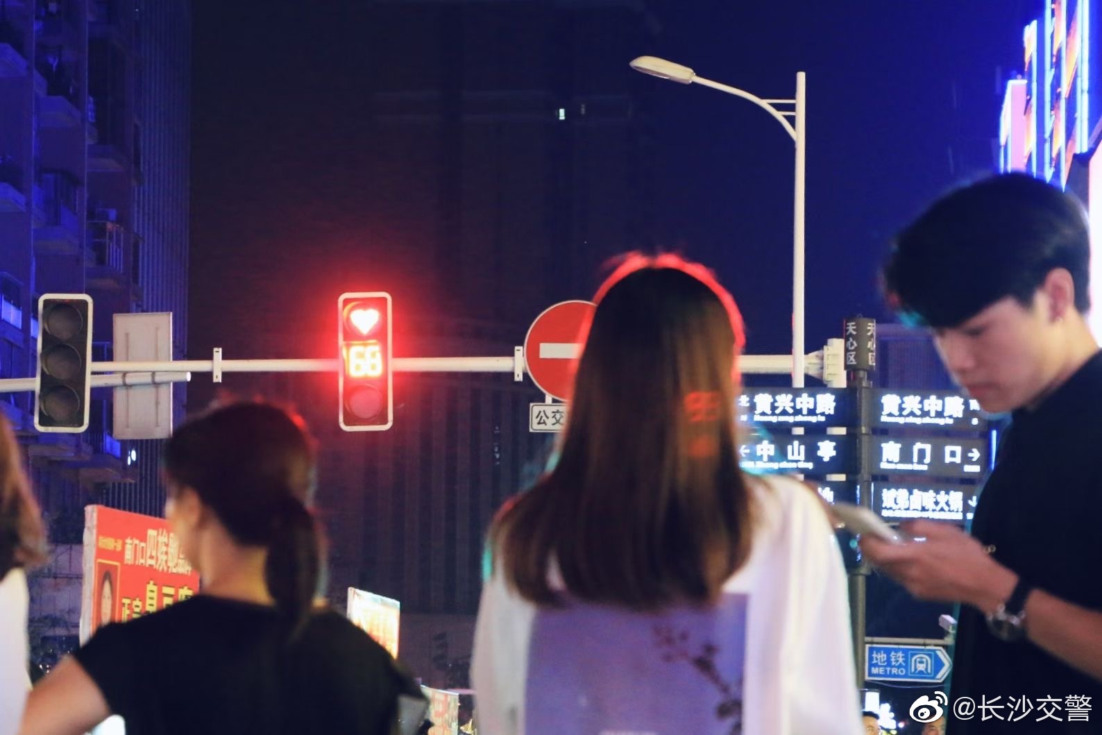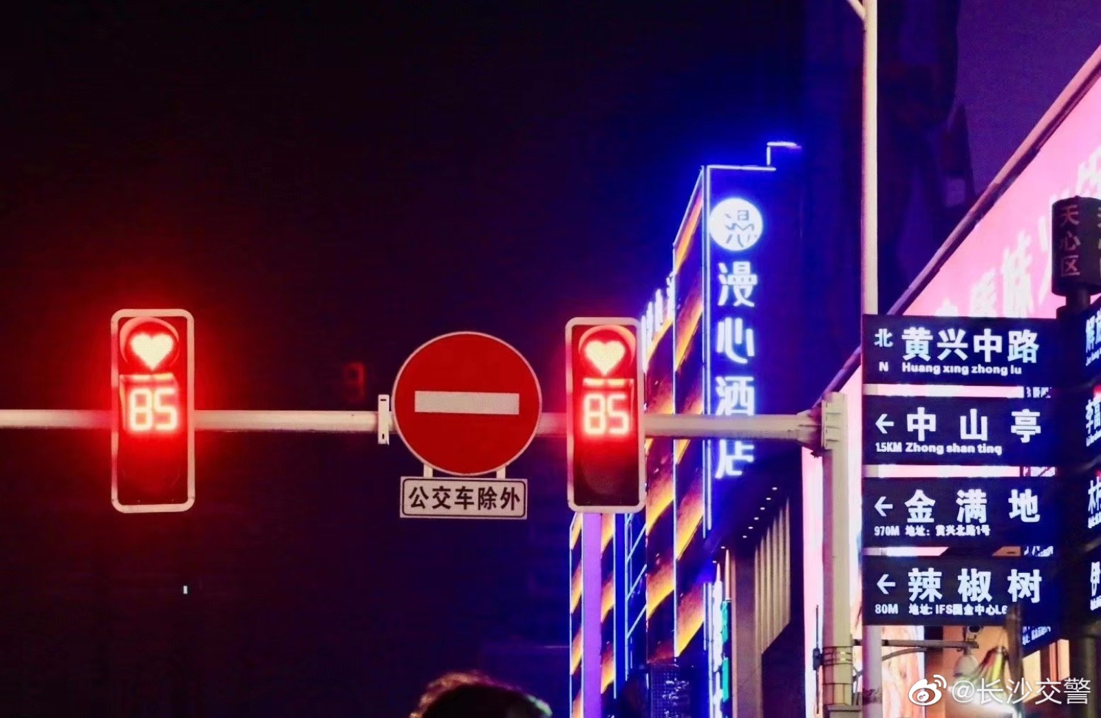 今日七夕,从昨晚起,湖南长沙街头多个红灯由圆形变成了心形。据了解,目前长沙司门口往北至五一广场,往西至湘江路口都有心形红灯,只有红灯“变形”,绿灯和黄灯还是圆形灯。(图片来源:长沙交警)