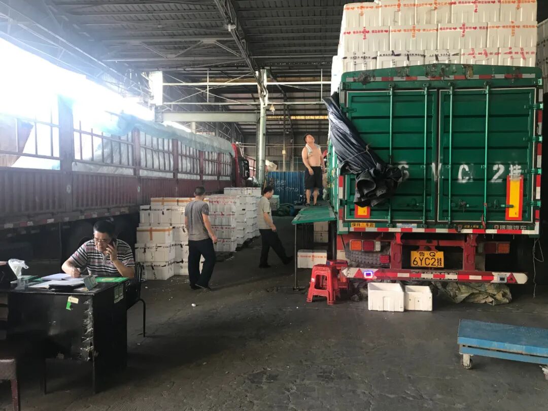 8月18号晚上6点,夜幕降临,一箱箱包装齐整的蔬菜像堆积木一样装进货车,从这里运往全国各地。李瑞清家的黄瓜将通过中茜物流的货运车运往上海。
