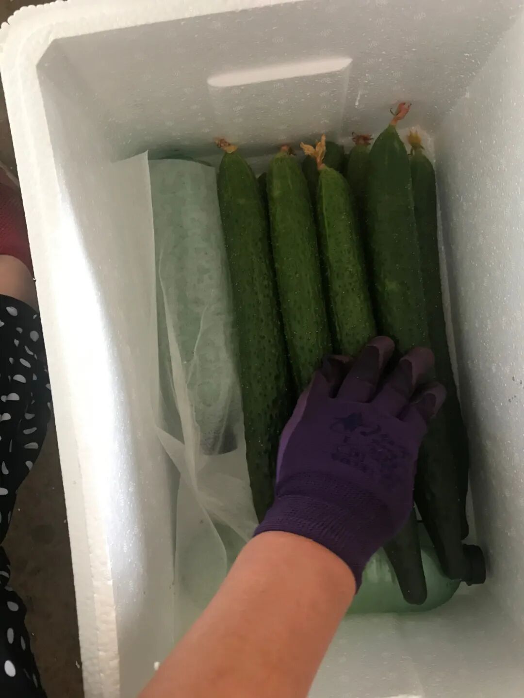刘红梅将分拣出的黄瓜整齐码放到白色泡沫箱里,箱子里内放了冰块,然后她用保鲜膜包裹、密封。