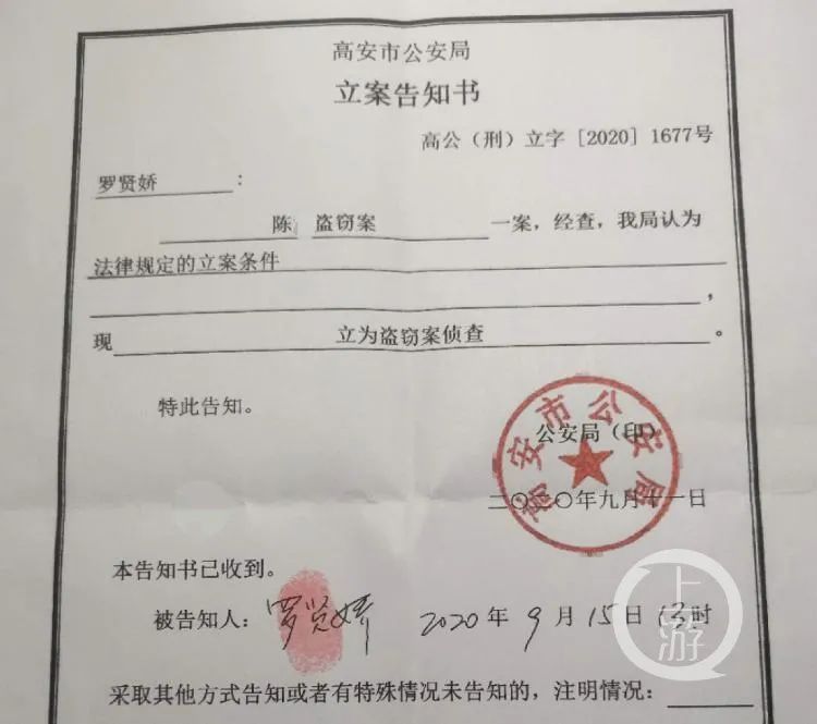 9月16日,记者从罗细妹家属处获悉,9月15日中午,江西省宜春市高安市公安局两名民警向罗细妹的妹妹罗贤娇,送达了奉新县公安局民警陈某涉嫌盗窃一案的立案告知书。两民警称,高安市公安局将此案定为盗窃案立案侦查。
