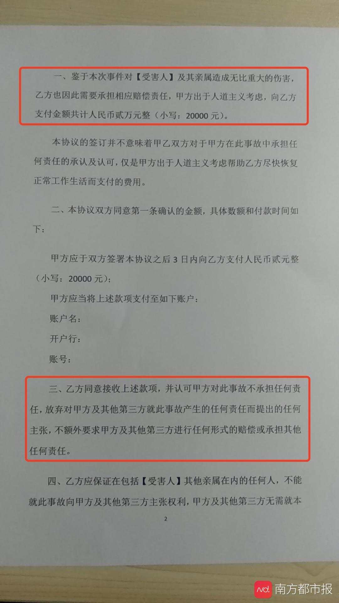 同时,“协议书”还写道,如果乙方(刘先生)接受这份协议,就要认可甲方对此次事故不承担任何责任,同时,还要刘先生保证,包括受害人其他亲属在内的任何人,不能就此次事故向甲方及其他第三方主张权利等。